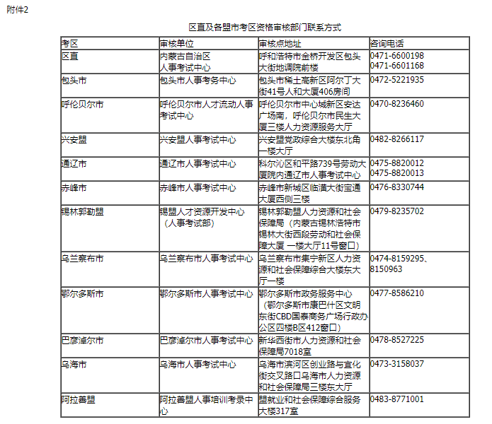 2.区直及各盟市考区资格审核部门联系方式