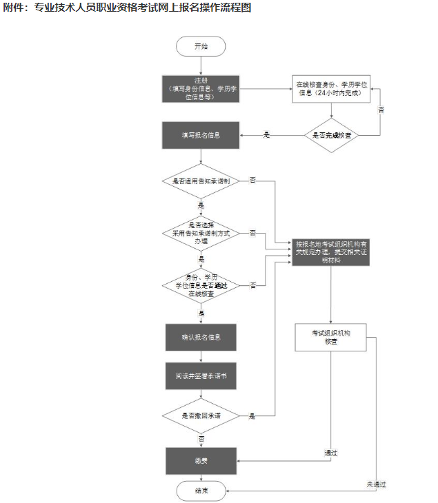 注册时,身份信息和学历(学位)信息在线核查结果为“核查通过”且选择并适用告知承诺制办理的报考人员,无需进行现场人工核查,系统将自动核查其报名资格,通过后直接缴费完成网上报名工作,届时打印准考证参加考试即可。