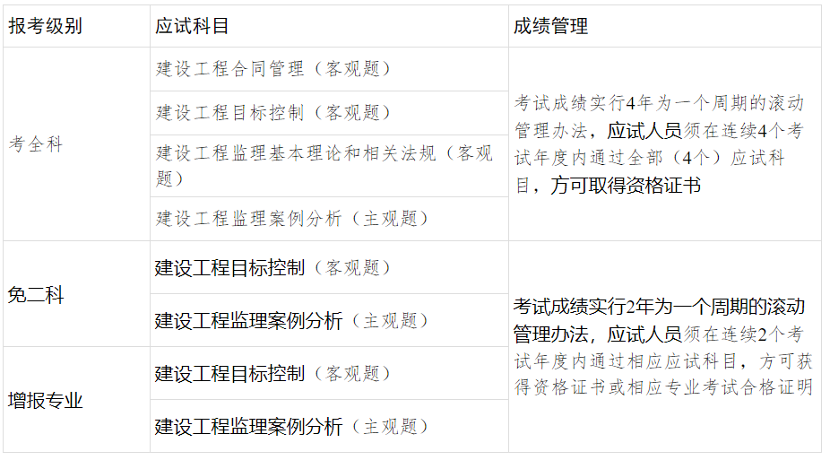 注:《建设工程合同管理》、《建设工程监理基本理论和相关法规》为基础科目;《建设工程目标控制》、《建设工程监理案例分析》为专业科目。专业类别分为土木建筑工程、交通运输工程和水利工程。