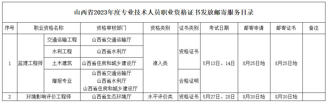 【邮寄目录】山西省2023年度专业技术人员职业资格证书发放邮寄服务目录
