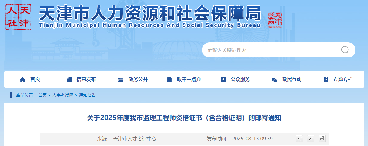 2025年度天津监理工程师资格证书(含合格证明)的邮寄最新通知,目前证书邮寄网上预定工作已结束,预计本周寄出,官方通知如下: