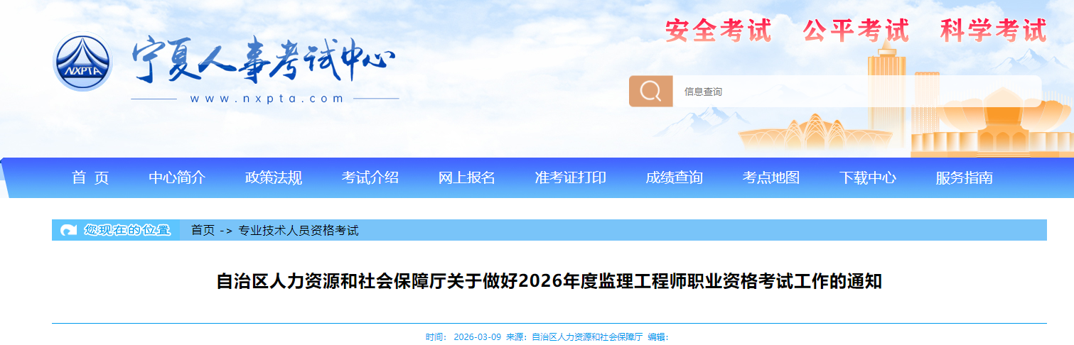 宁夏考区2026年度监理工程师职业资格考试工作的通知已发布,网上报名时间3月16日9时-3月27日17时;现场核查时间3月16日至3月30日;网上缴费时间3月16日9时-3月31日23时;准考证打印时间5月11日9时-5月17日14时;考试时间5月16日、17日。详情如下: