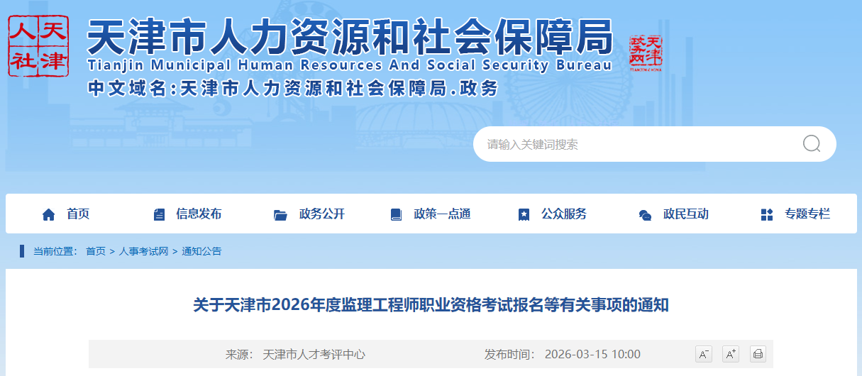 天津市2026年度监理工程师职业资格考试报名等有关事项的通知已发布,报名时间:2026年3月20日9:00至3月30日15:00;审核时间:2026年3月20日9:00;缴费时间:2026年3月20日9:00至4月2日15:00;准考证打印时间:2026年5月13日9:00至15日24:00;考试时间:5月16日、17日。详情如下: