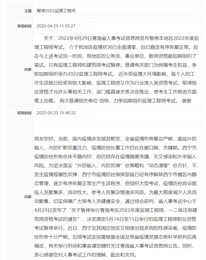 考生信件内容:关于,2022年4月29日青海省人事考试信息网发布暂停本地区2022年度监理工程师考试。 介于我地区疫情状况已全面清零,且已稳定有序恢复正常。且在与上述考试同一时间,我地区的公务员、事业单位、教师资格都如期组织了笔试。只有监理工程师和建筑师考试暂停。恳请有关部门为保障考生权益,争取如期组织举办2022监理工程师考试。 近年受疫情大环境影响,每个人的工作生活就已经受到极大影响,监理工程师又作为行业准入类资格考试,取得相应资格才允许从事相关工作,该门槛直接关系决定就业,使考生工作前进方面难上加难。 再次恳请相关单位 领导,力争如期组织监理工程师考试。 谢谢