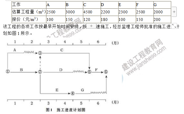 合同约定:工期6个月;A、B工作所用的材料由建设单位采购;施工期间若遇物价上涨,只对钢材、水泥和骨料的价格进行调整,调整依据为工程造价管理部门公布的材料价格指数。招标文件中工程量清单所列各项工作的估算工程量和施工单位的报价如表1所示。