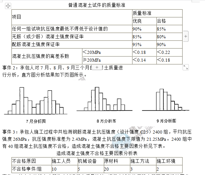 事件4:某座左岸排水建筑物底板混凝土质量检验,混凝土试块抗压强度既不满足设计要求,也不满足《水利水电工程施工质量检验与评定规程》(SL176—2007)的要求。经过钻芯检测的21个试件为样本,混凝土抗压强度推定值20.64为设计值30MPa的68.8%,低于设计值31.2%。由于混凝土强度不满足设计及《水利水电工程施工质量检验与评定规程》(SL176-2007)要求,且混凝土质量极不均一,拆除重建,造成经济损失30万元。