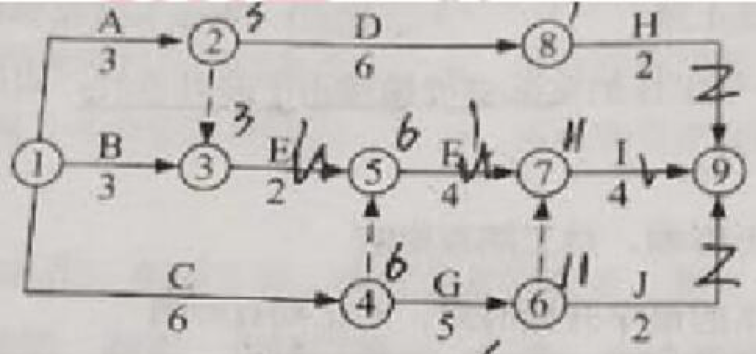 【解析】本题考查的是双代号网络计划的时间参数的计算。ESF=6,EFF=6+4=10,TFF=1,LFF=TFF+EFF=1+10=11。参见教材P47。