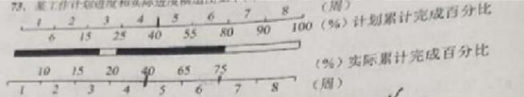 【解析】本题考查的是横道图比较法。选项A错误,前6周在第3周有中断;选项B错误,第2周的计划进度为15-6=9,实际进度=15-10=5,进度滞后;选项D错误,第6周的计划进度为80-55=25,实际进度=75-65=10,进度滞后。参见教材P92。
