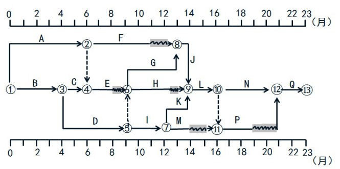 某工程,建设单位与施工单位按照《建设工程施工合同(示范文本)》签订了施工合同,经项目监理机构批准的施工总进度计划如图5-1所示(时间单位:月),各项工作均按最早开始时间安排且匀速施工。