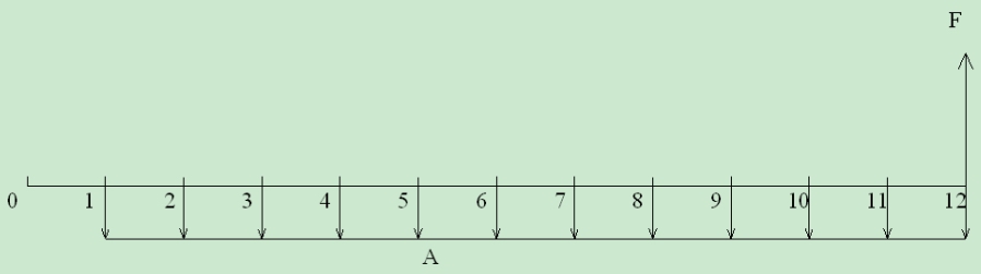 从一月份开始,每月月末存入银行200元,包括1月份,也包括12月份,一共12个月。现金流量图如下。