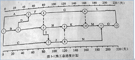 某工程,建设单位与施工单位签订了施工合同,合同工期为220天。经总监理工程师批准的施工总进度如图5-1所示,各项工作均按最早开始时间安排且匀速施工。