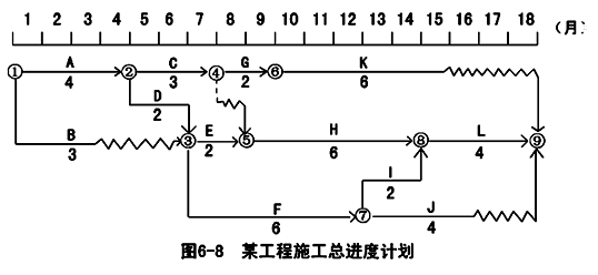 3.施工进度滞后影响到施工合同约定的工期例6-2:某建设工程业主与监理单位、施工单位分别签订了监理委托合同和施工合同,合同工期为18个月。在工程开工前,施工承包单位在合同约定的时间内向监理工程师提交了施工总进度计划如图6-8所示。