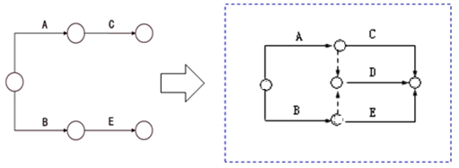 ③如果不存在情况①和情况②时,应判断本工作的所有紧前工作是否都同时作为其他工作的紧前工作,按如下规则绘制: