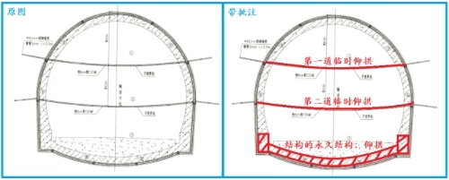 对于隧道来说,底部设置的仰拱是永久的(是隧道的一部分,不拆),然而在开挖过程中(台阶法或CRD法……)在中部设置的临时仰拱是为了确保开挖安全稳定,来支撑隧道左右两侧及一部分向上的支持力的,当施做完围岩衬砌就会拆除,那么这就是临时仰拱啦。