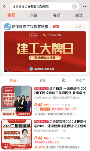 22日-23日建设工程教育网天猫期间店每晚19:00均有福利直播等着你!赶快打开您的手机淘宝,搜索“建设工程教育网”进入店铺享受优惠吧!