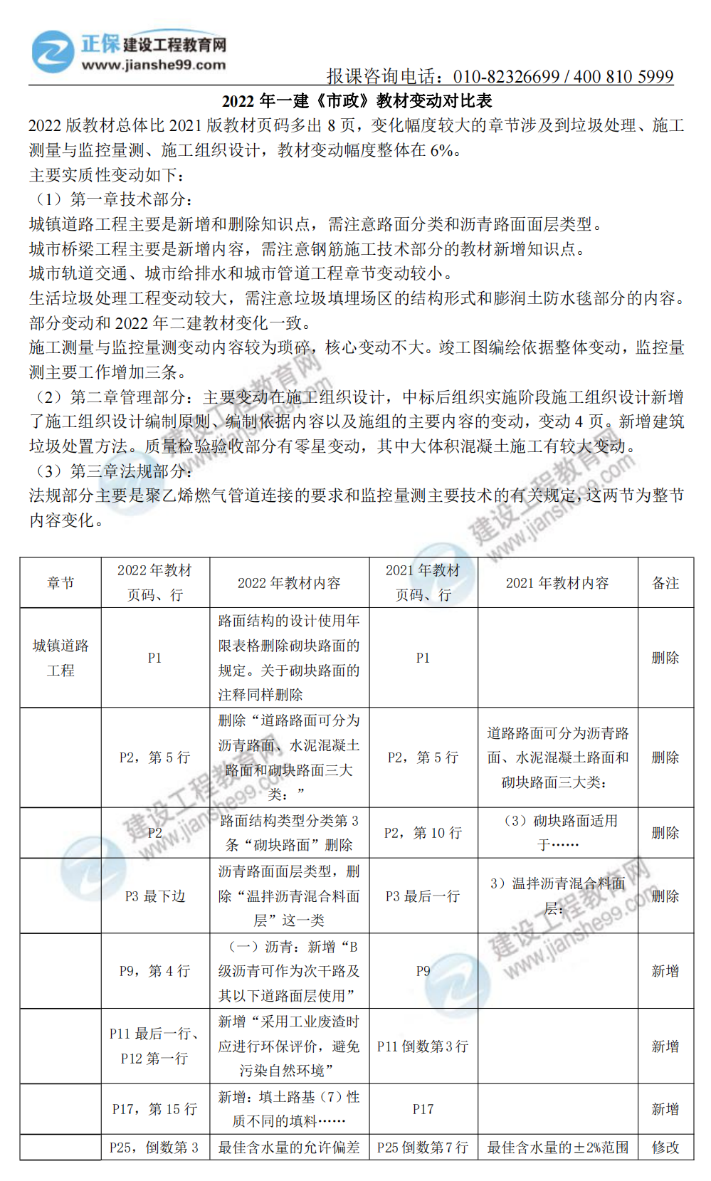 2022年一级建造师工程经济新教材变化大吗?变动有哪些?建设工程教育网老师为考生们整理了一建《市政公用工程管理与实务》新旧教材变化对比解析,抢先看起来!