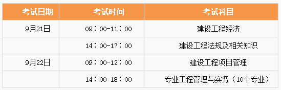 《建设工程经济》的考试时间为2小时,《建设工程项目管理》、《建设工程法规及相关知识》的考试时间为3小时,《专业工程管理与实务》的考试时间为4小时。考生必须在连续的两个考试年度内通过全部科目的考试,方可获得一级建造师资格证书。本次考试历时两天,考试时间安排如下:
