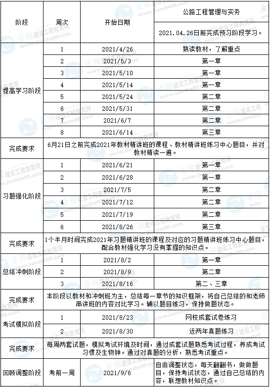 2、已报网校2021年以及建造师辅导超值精品班/高效实验班/无忧直达班/VIP特训营的同学,将由班主任老师根据您的信息反馈及学习时间制定更详尽的计划表,如与本表不一致,请以班主任老师制定的学习计划为准。