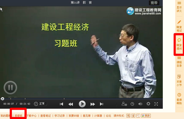 方法二:在视频讲座听课页面,点击右侧的【随堂提问】按钮或底部的【答疑板】按钮即可: