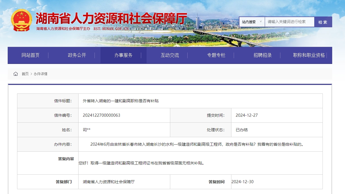 问题:2024年6月由吉林省长春市转入湖南长沙的水利一级建造师和副高级工程师,政府是否有补贴?我看有的省份是给补贴的。