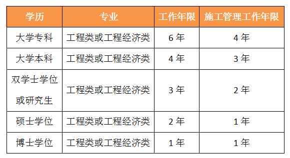1、 取得工程类或工程经济类大学专科学历,工作满6年,其中从事建设工程项目施工管理工作满4年。