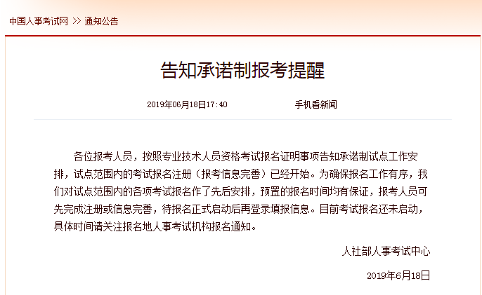 各位报考人员,按照专业技术人员资格考试报名证明事项告知承诺制试点工作安排,试点范围内的考试报名注册(报考信息完善)已经开始。为确保报名工作有序,我们对试点范围内的各项考试报名作了先后安排,预置的报名时间均有保证,报考人员可先完成注册或信息完善,待报名正式启动后再登录填报信息。目前考试报名还未启动,具体时间请关注网站的考务通知。