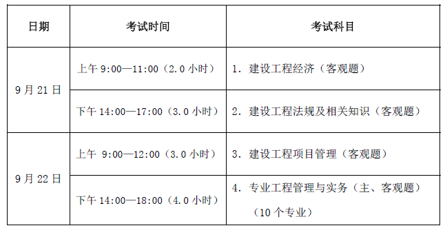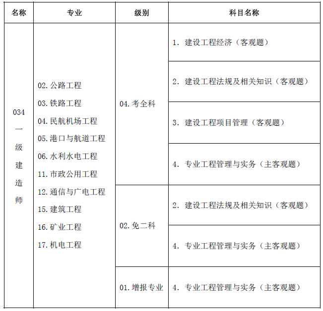 表一:一级建造师资格考试名称、级别、专业及考试科目信息