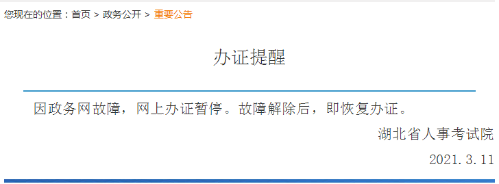 湖北人事考试网发布《办证提醒》,因政务网故障,网上办证暂停。