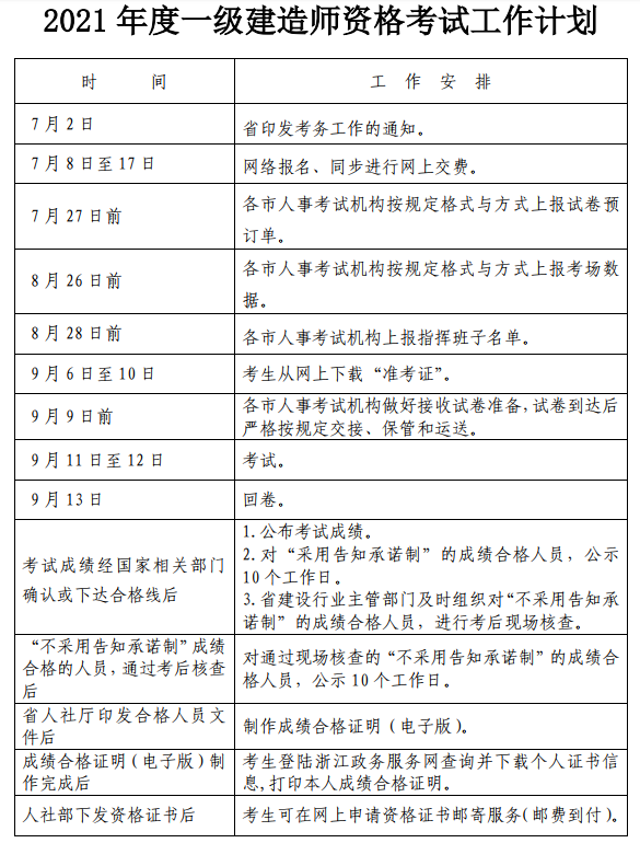 浙江人事网发布《关于做好2021年度一级建造师资格考试考务工作的通知》,浙江2021年度一级建造师报名时间为2021年7月8日至17日,具体内容如下: