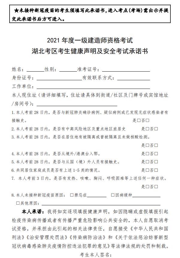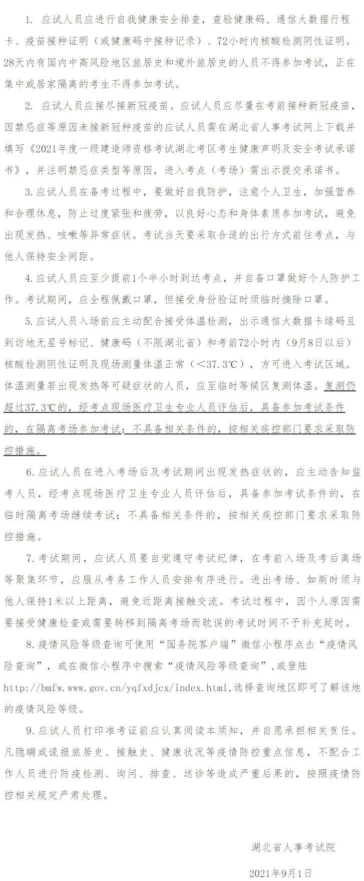 2021年度全国一级建造师资格考试湖北考区疫情防控须知
