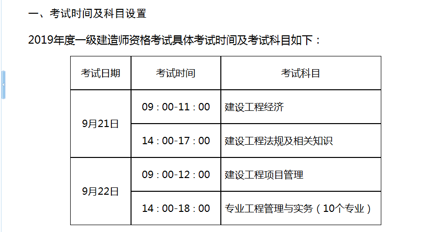 一、 考试时间及科目设置2019年度一级建造师资格考试具体考试时间及考试科目如下: