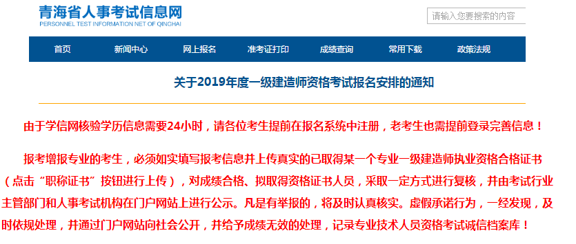 青海省人事考试信息网公布了2019年青海一级建造师考试报名时间为2019年7月6日—7月20日。详细内容请查看官方考务文件。