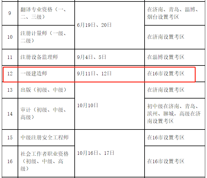 山东人事考试网发布2021年一级建造师考试计划及考区,2021年一级建造师考试时间9月11日、12日考试,在16市设置考区。