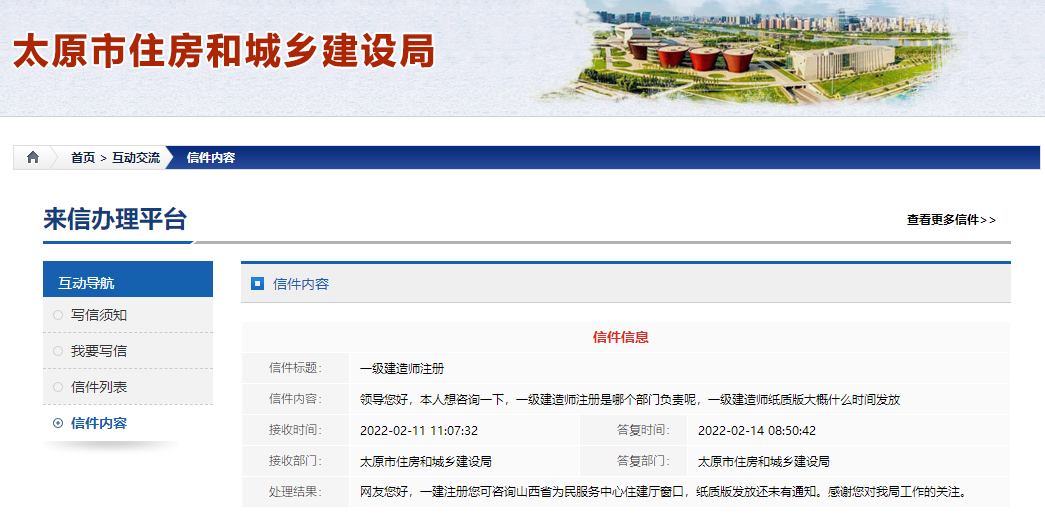 太原市住房和城乡建设局收到学员问题,一级建造师注册是哪个部门负责呢,一级建造师纸质版大概什么时间发放?针对这个问题,太原市住房和城乡建设局给出以下回复: