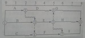 【答案解析】:本题考查的是工程网络计划有关时间参数的计算。关键线路为B-F-I,A的总时差为2-3节点的波形线长,即1周。参见教材P132.