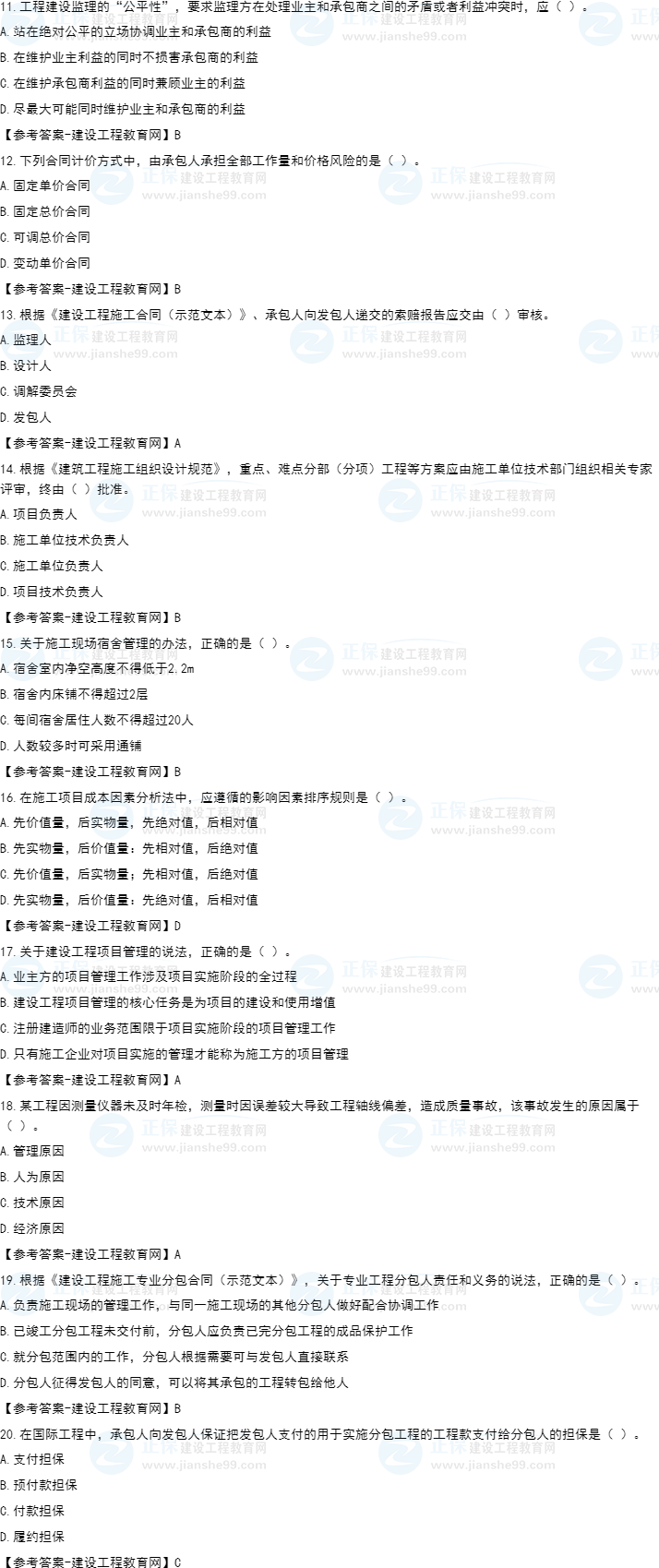 2022年一级建造师补考项目管理试题及答案11-20题。建设工程教育网考后将会根据学员反馈,及时汇总2022年一级建造师补考项目管理试题及答案分享给大家,并且会及时做出答案解析,希望能为广大一建考生朋友带来帮助。