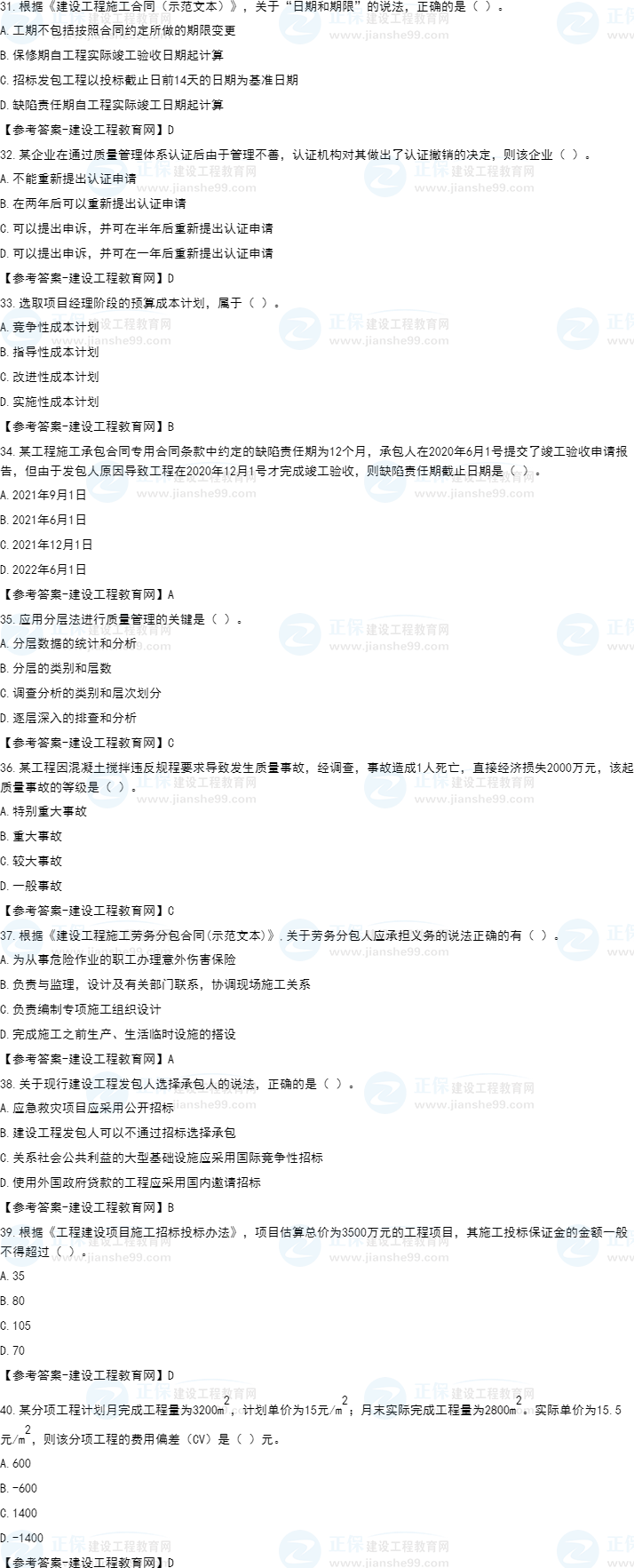 2022年一级建造师补考项目管理试题及答案31-40题。建设工程教育网考后将会根据学员反馈,及时汇总2022年一级建造师补考项目管理试题及答案分享给大家,并且会及时做出答案解析,希望能为广大一建考生朋友带来帮助。
