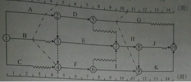 94.某工程项目的双代号时标网络计划,当计划执行到第4周末及第10周末时,检查得出实际进度前锋线如下图所示,检查结果表明( )。