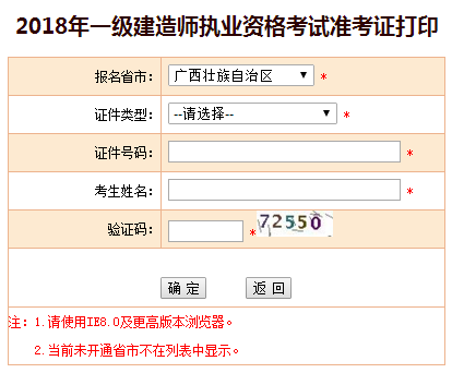 2018年广西一级建造师准考证打印流程:进入中国人事考试网()→进入“打印准考证”栏目→选择“一级建造师资格考试”(入口开通后列表会有显示)→按照提示完成准考证打印工作。