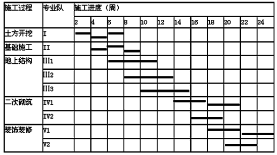 其中:施工顺序Ⅰ→Ⅱ→Ⅲ;施工过程Ⅱ与施工过程Ⅲ之间存在工艺间隔时间1周。