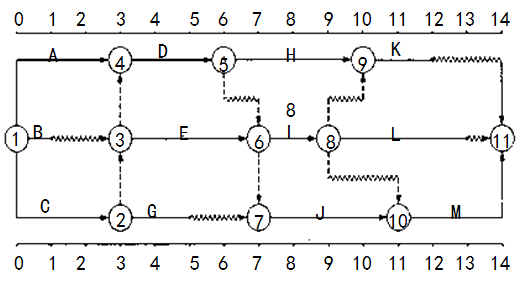 在双代号时标网络计划,计算哪个工作的总时差,就计算那个工作后的所有线路的波形线的和,那么波形线的和的最小值为该工作的总时差。工作A的5-6波形线的长,即为1.