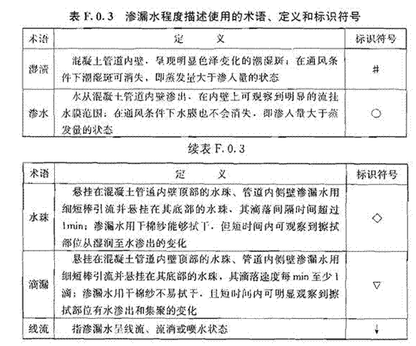 F.0.3 渗漏水程度描述使用的术语、定义和标识符号,可按表F.0.3采用。
