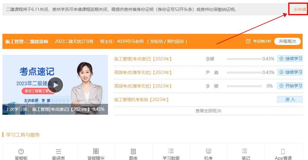 网校2023年二级建造师课程将于6月11日关闭,贵州考生可在我的网校我的家申请课程延期,我们将为贵州考生将课程延期至贵州考后一周。课程延期申请入口将于6月10日0点关闭,逾期无法申请。