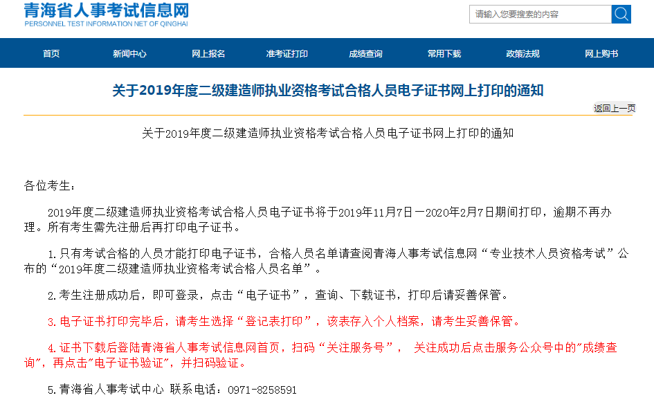青海2019年度二级建造师执业资格考试合格人员电子证书将于2019年11月7日—2020年2月7日期间打印,逾期不再办理。所有考生需先注册后再打印电子证书。