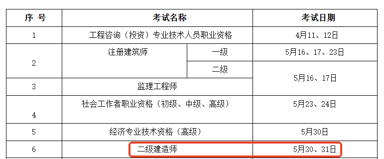 湖南人事考试网发布湖南省2026年度专业技术人员职业资格考试计划表,其中二级建造师考试时间为:5月30、31日,具体信息如下: