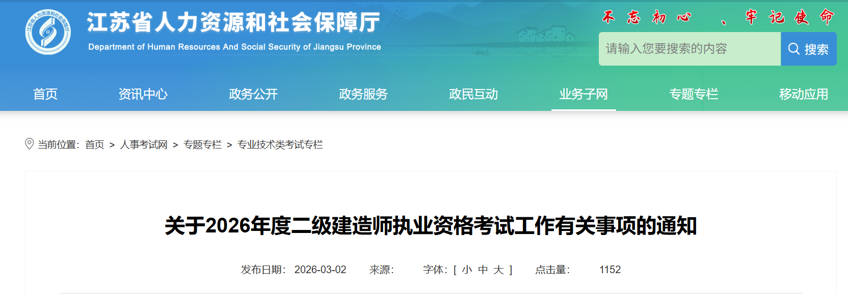 江苏省人力资源和社会保障厅发布关于2026年度二级建造师执业资格考试工作有关事项的通知,报名时间:2026年3月5日9:00至2 0日16:00,报名网站网址:江苏人事考试网(http://jiangsu nomax.vip/tip/),缴费时间为2026年3月5日至21日,准考证打印时间:2026年5月25日至29日,考试时间:5月30日、31日,合格标准:试卷满分的60%(如有特殊情况,由长三角地区两省一市协商划定并另行通告),具体信息如下: