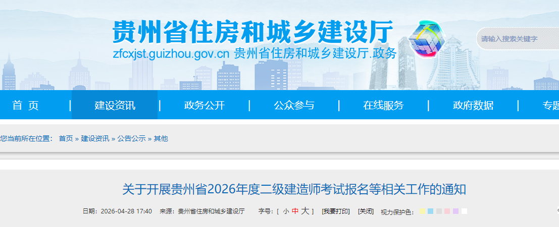 (二)有关本次考试全周期的重要信息,将通过“贵州省住房和城乡建设厅”(http://zfcxjst.guizhou.gov.cn/)网站及时发布,请报考人员保持关注,以免贻误。
