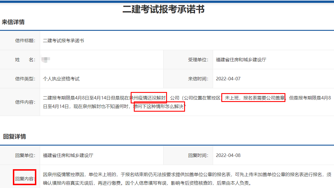 考生提问:二建报考期限是4月8日至4月14日但是现在泉州疫情还没解封,公司(公司位置在管控区)未上班,报名表需要公司盖章,但是报考期限是4月8日至4月14日,现在泉州解封也不知道何时,想问下这种情形怎么解决?