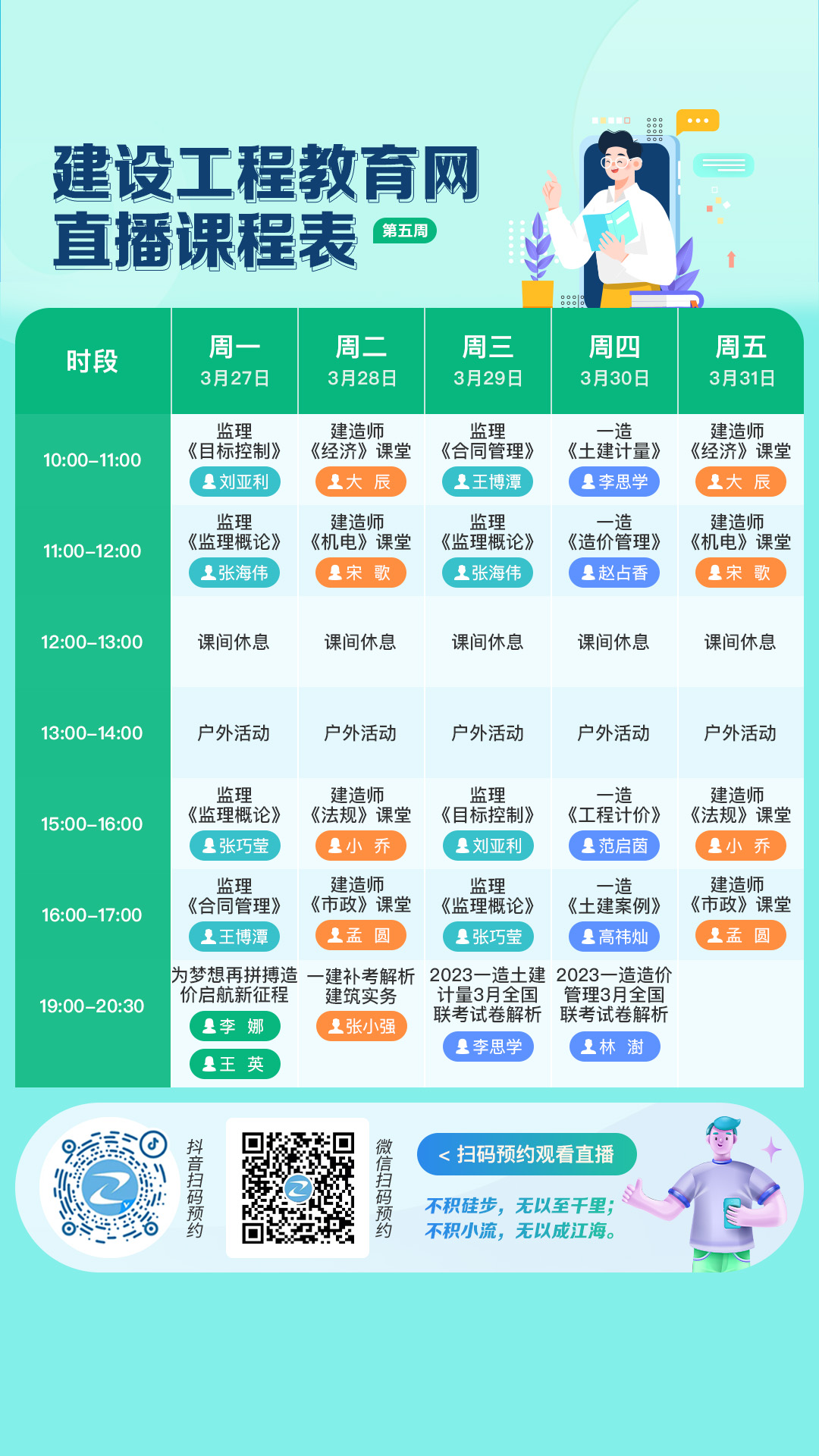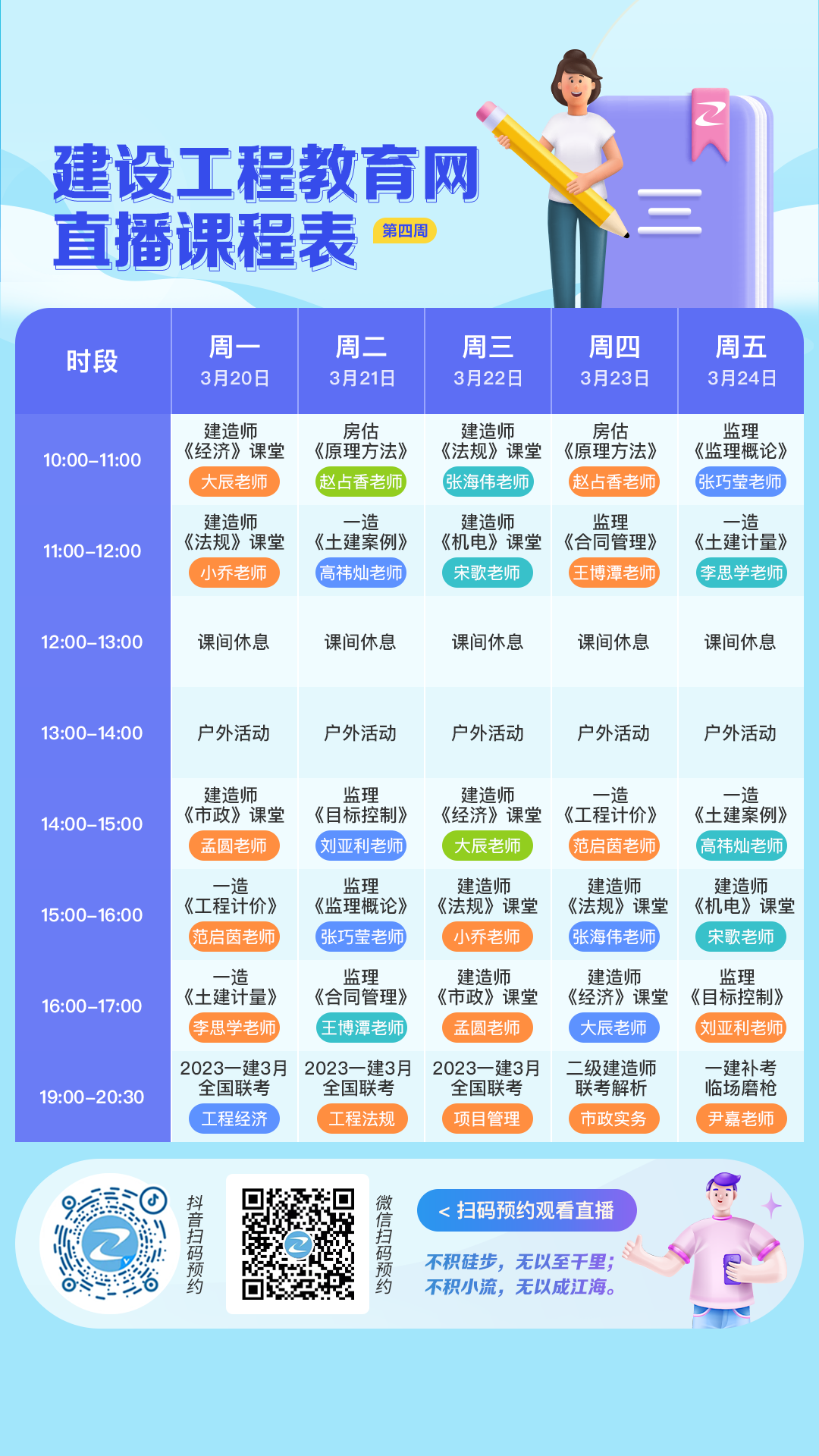 星光不问赶路人,时光不负有心人。为帮助建工考生们找对备考方向,解决备考中遇到的问题,建设工程教育网针对建造师、一级造价工程师、监理工程师、房地产估价师考试备考开设建工直播小课堂带你刷题,直播答疑!