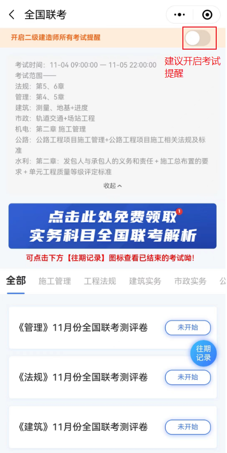 建议开通考试提醒,避免错过二建考试。